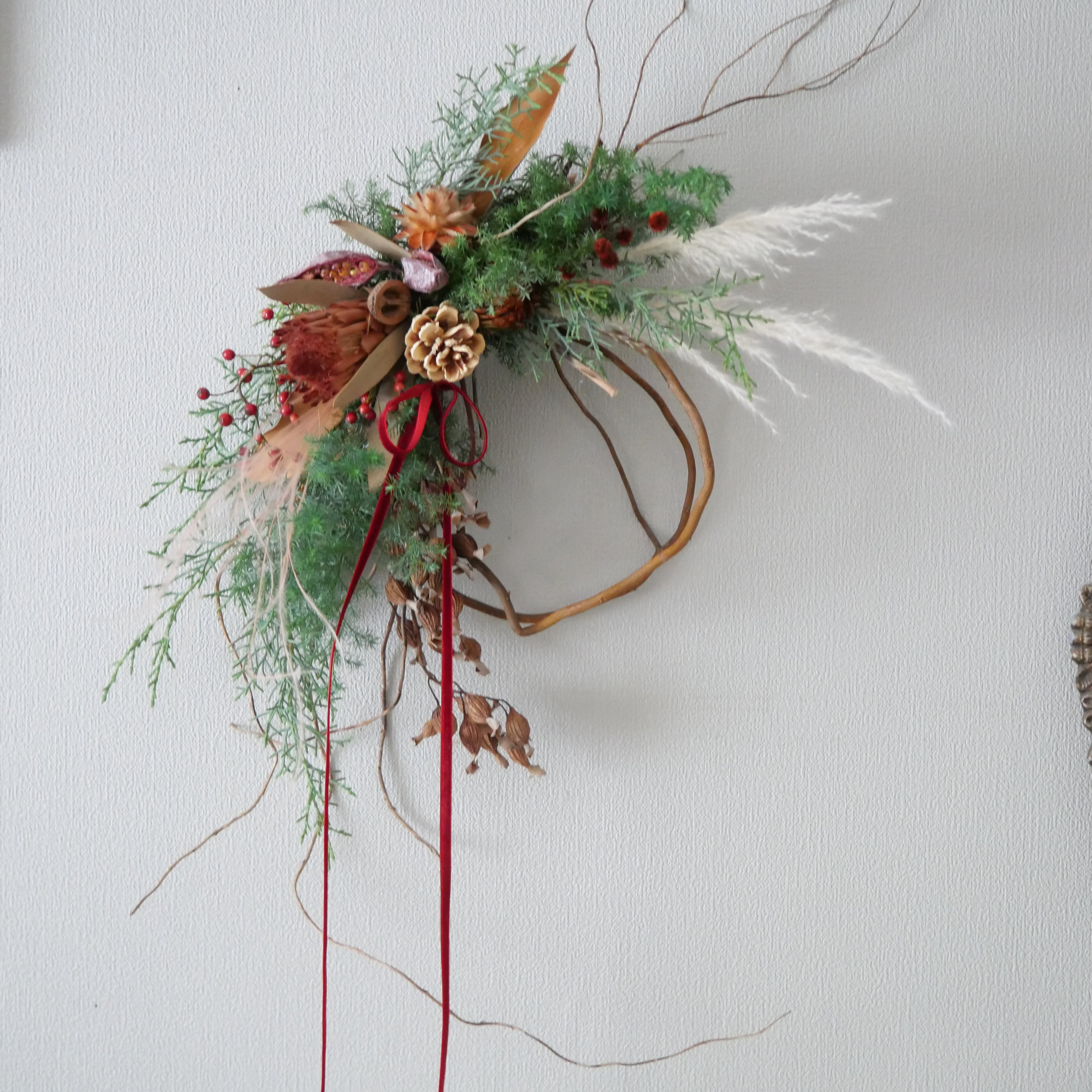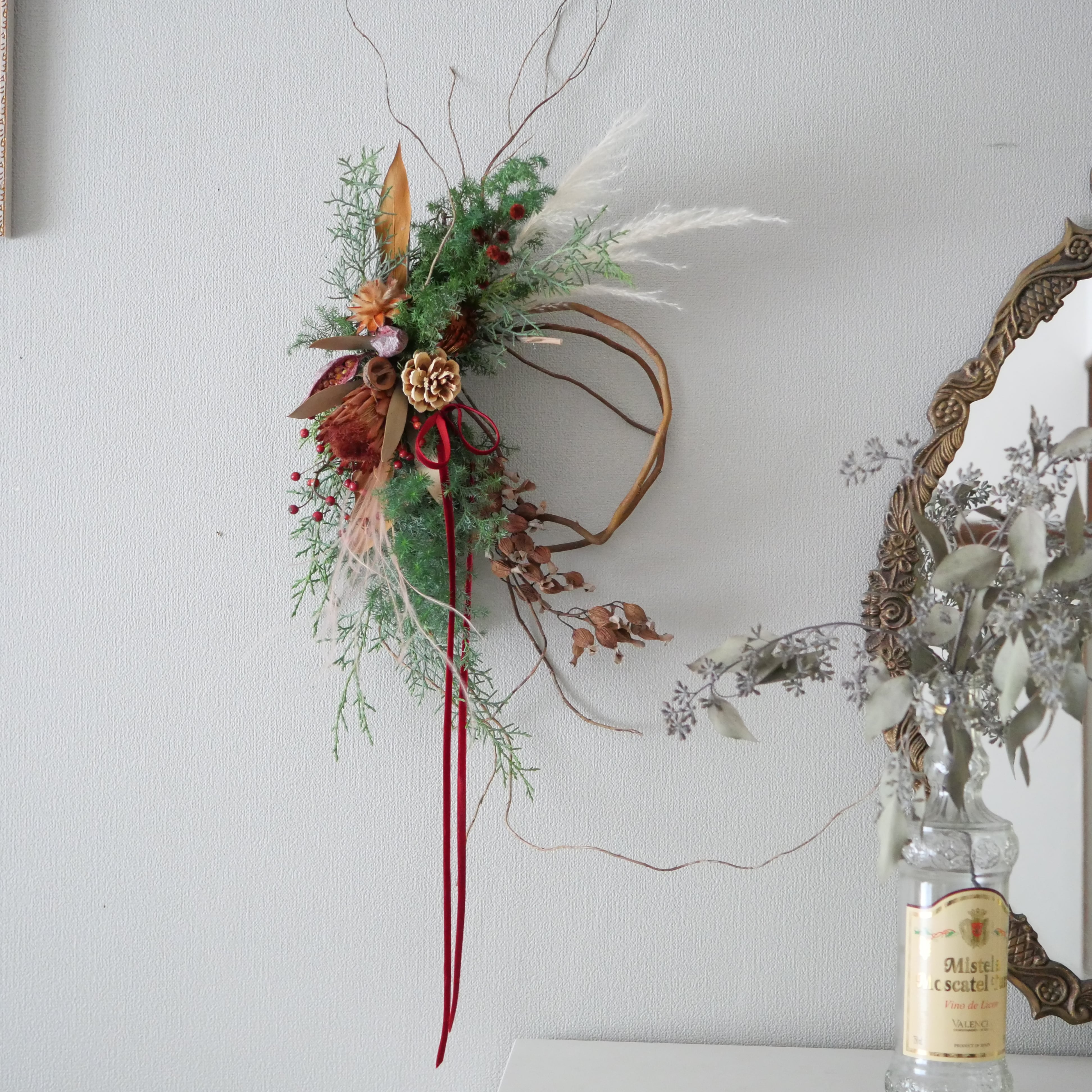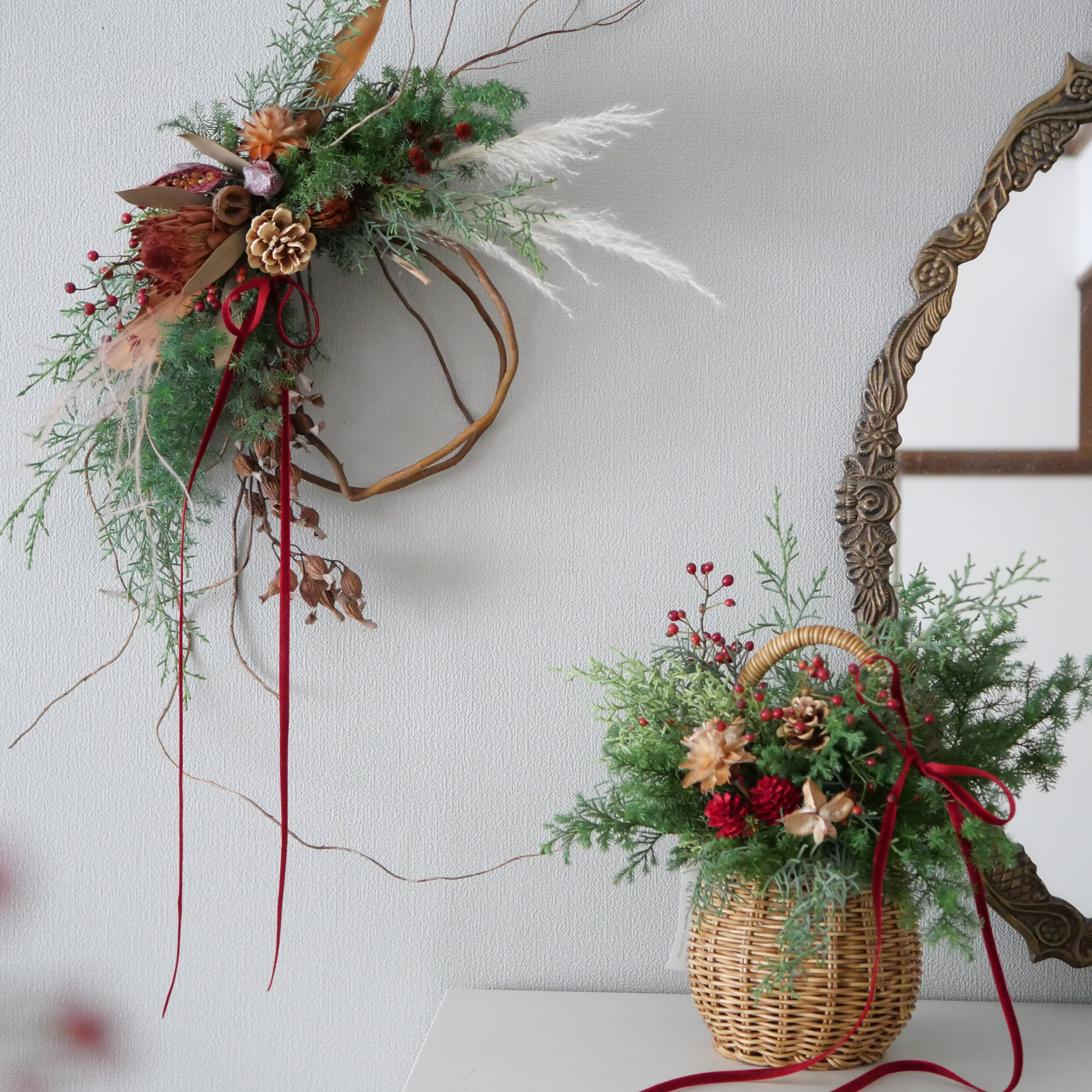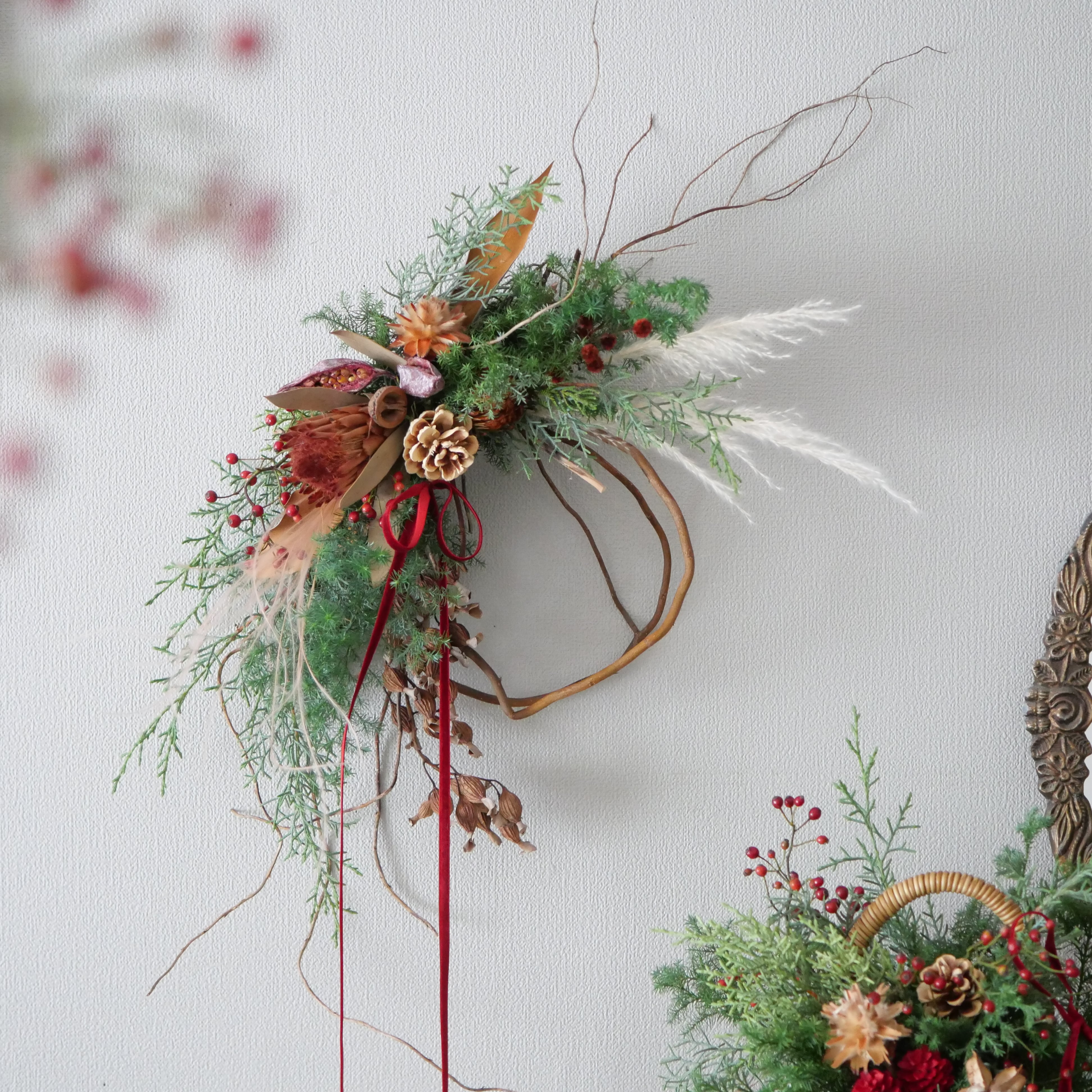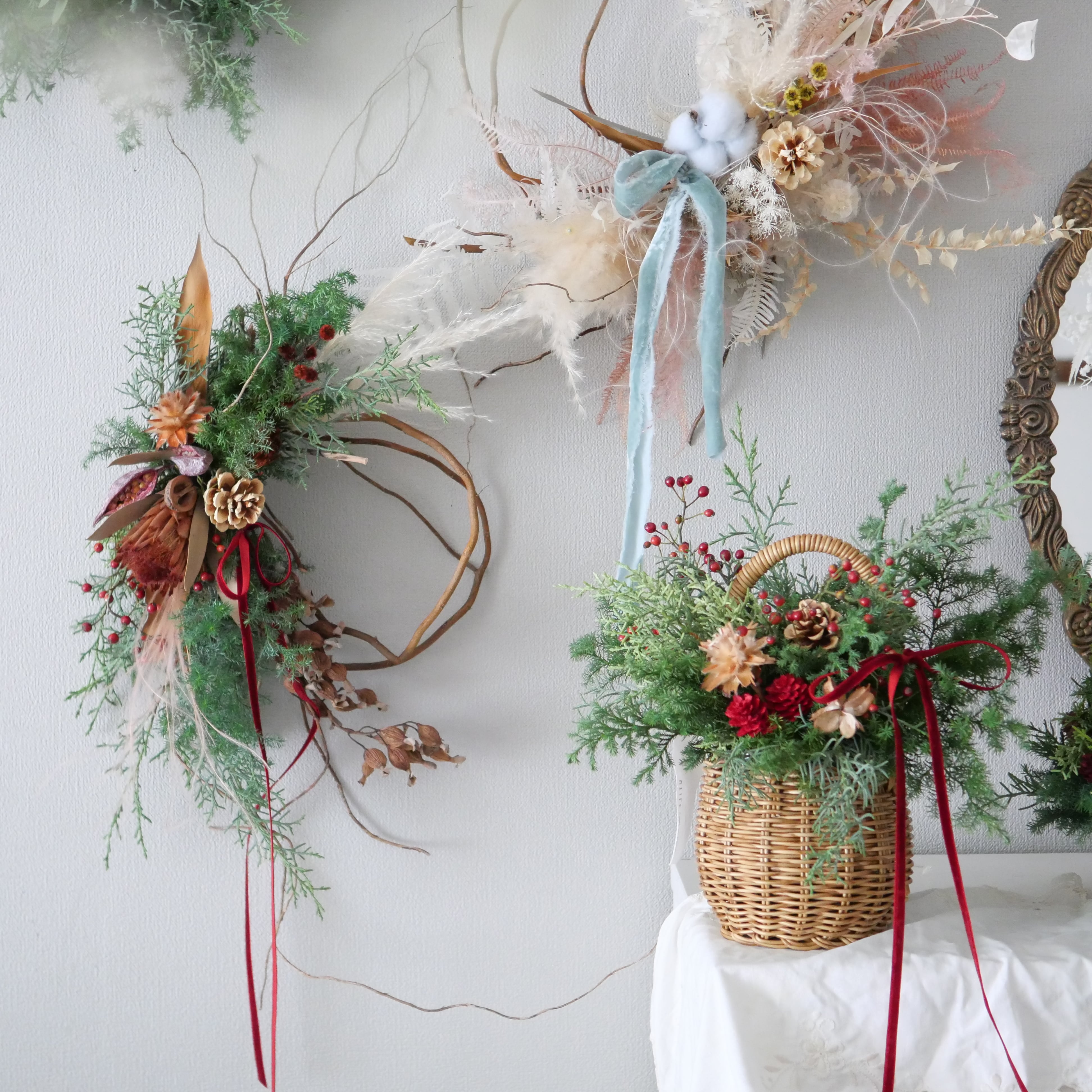 フレッシュのグリーンはそのままドライフラワーへと変化し、色も綺麗なまま、クリスマスまで長くお楽しみ頂けます。
