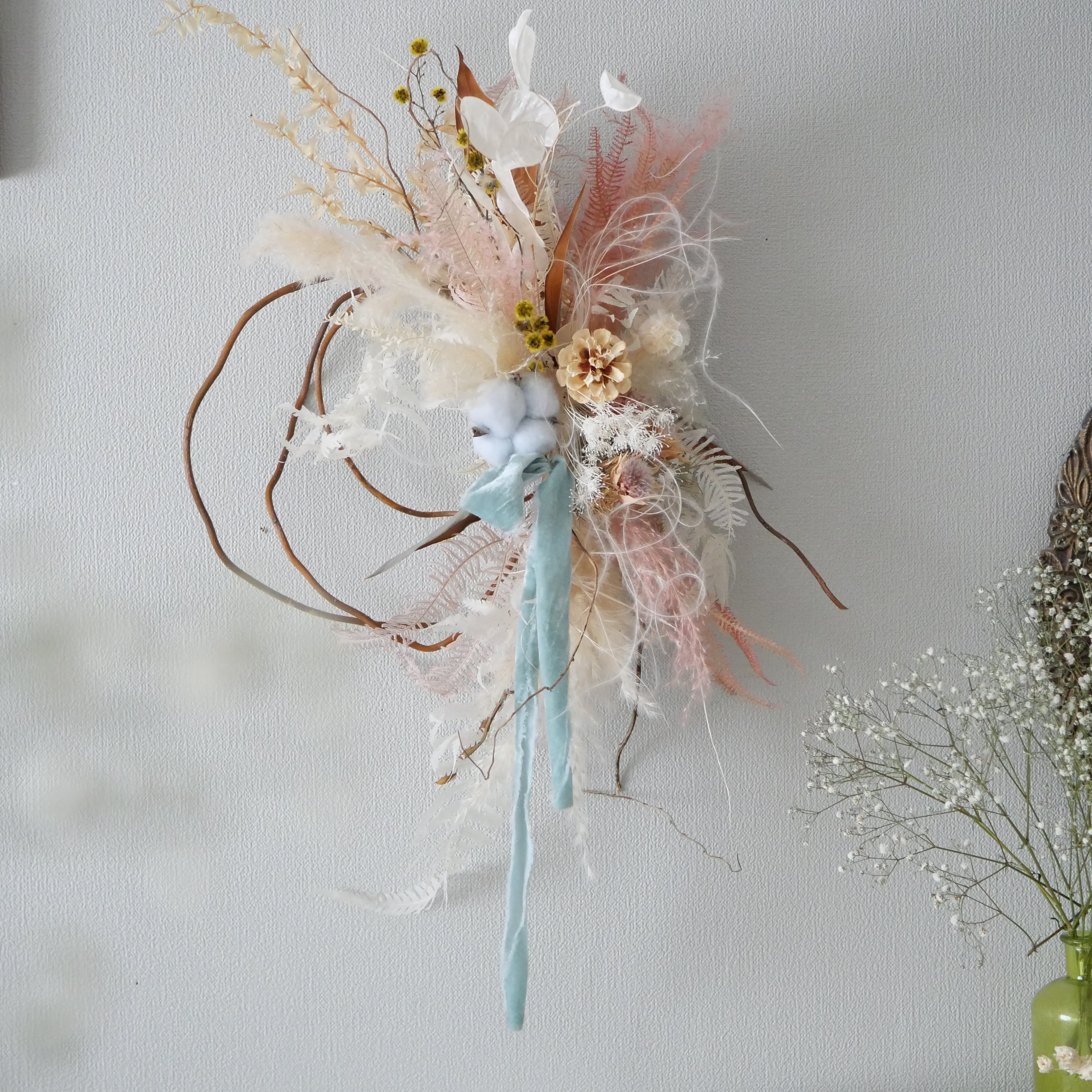 新登場【dry flower】 pale color Wreath 水色ベロアリボン付き
