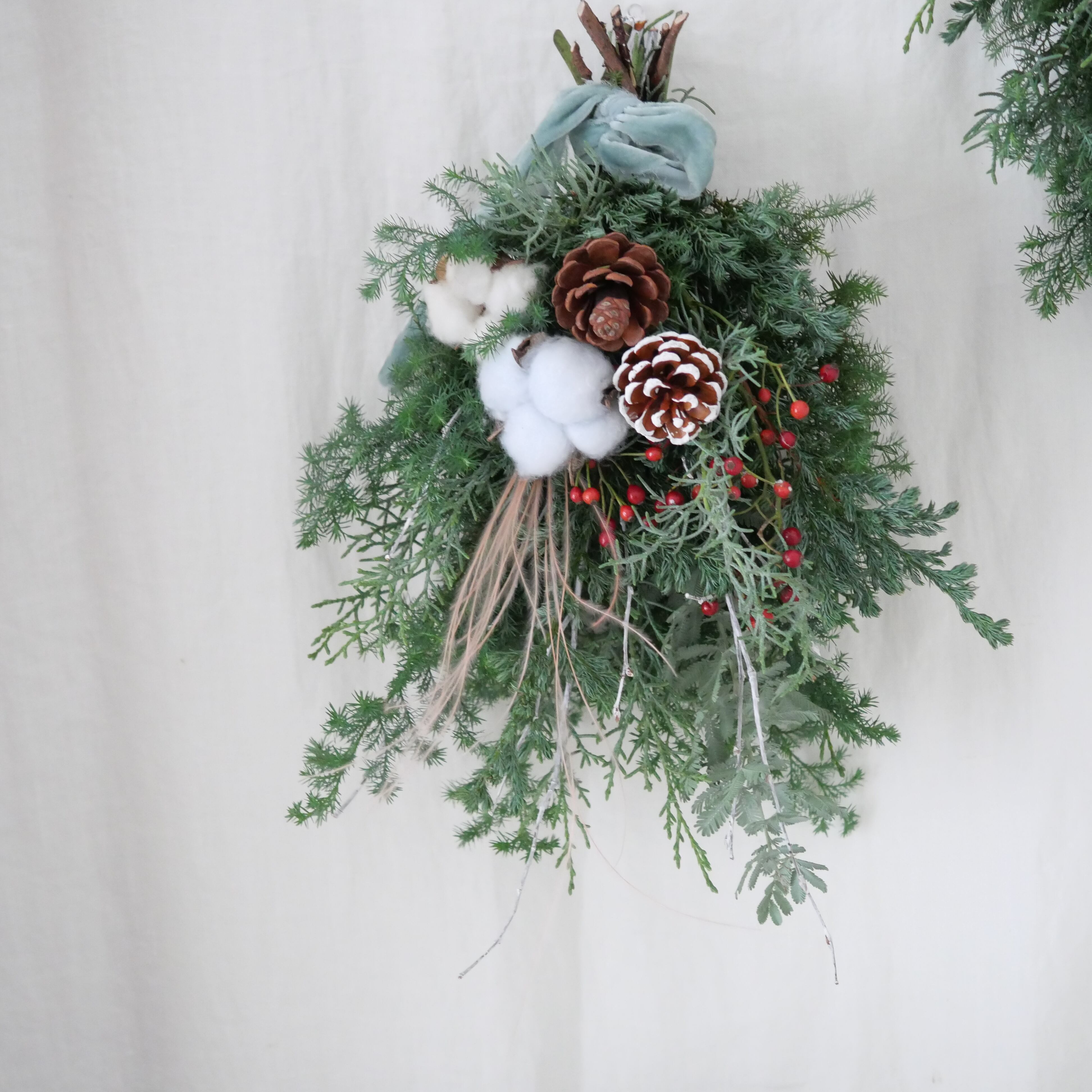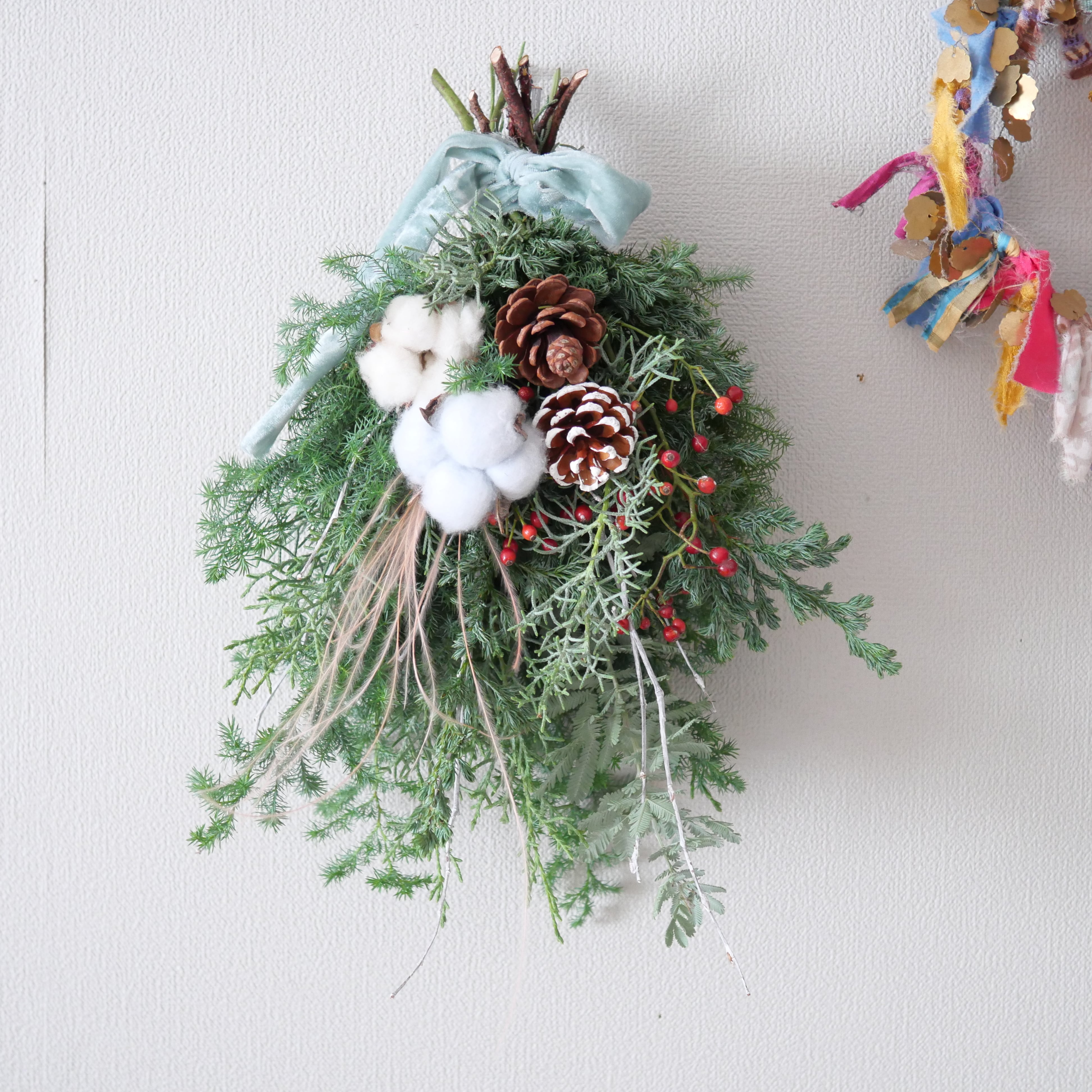 【NEW】クリスマスのスワッグ Swag 水色コットン&ベロアリボン付き