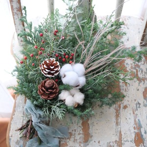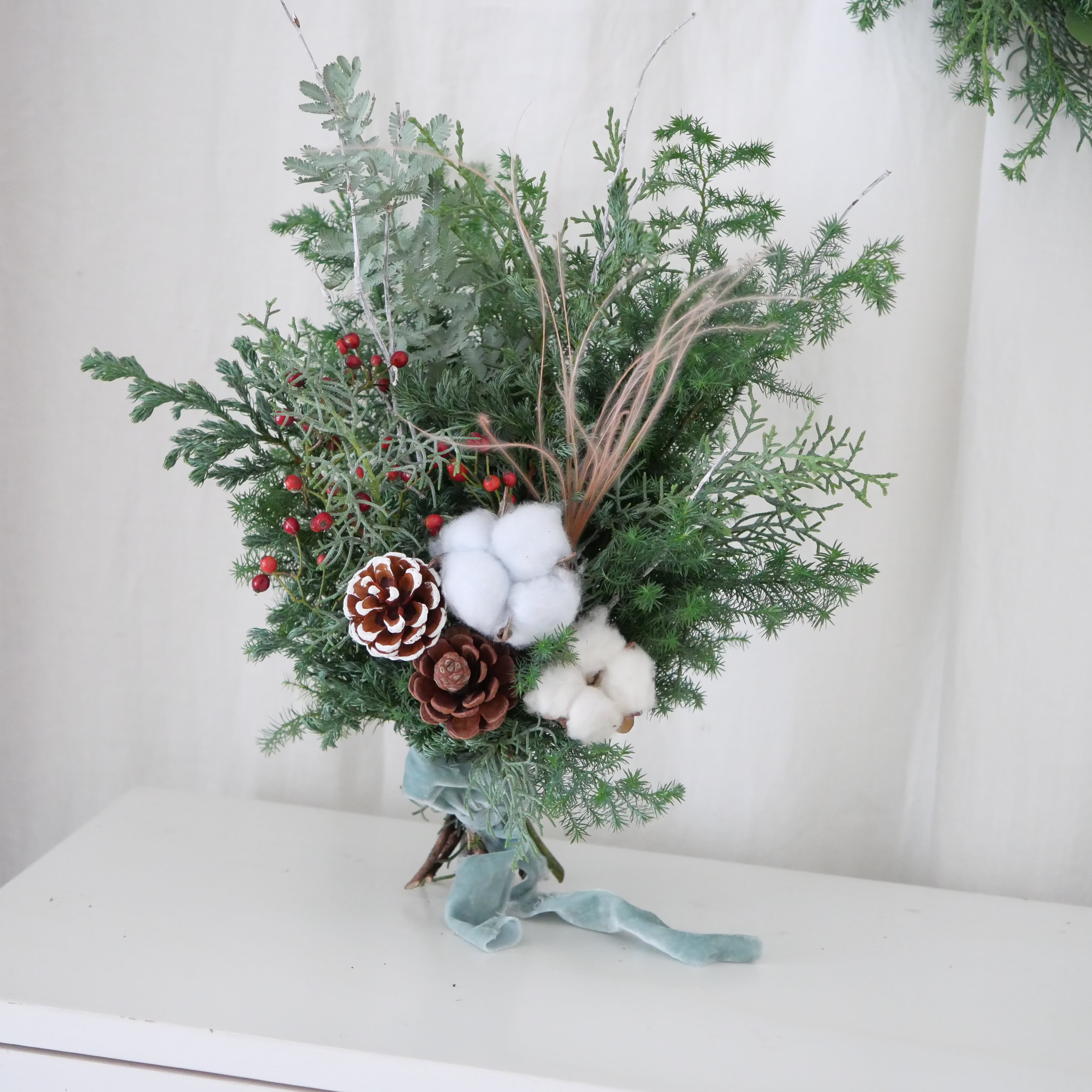 生花のヒバやヒムロ、バラの実、松ぼっくり、コットンなどを束ね、人気の水色ベロアリボンをあしらった、おしゃれなナチュラルスワッグ。