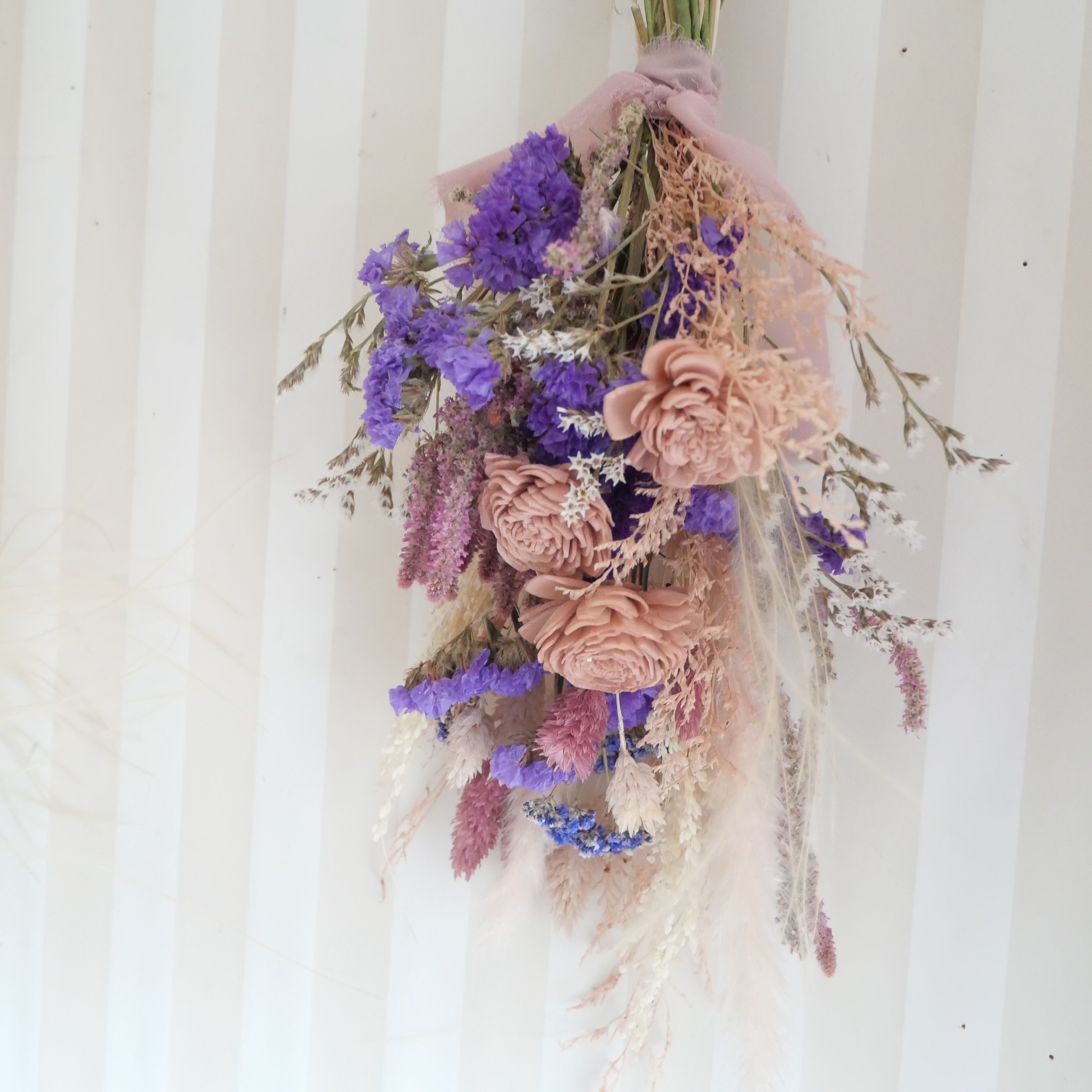 くすみピンク、ベージュなど、淡いニュアンスカラー+紫色のお花をあしらった、お洒落なスモーキーカラーのswag花束です。