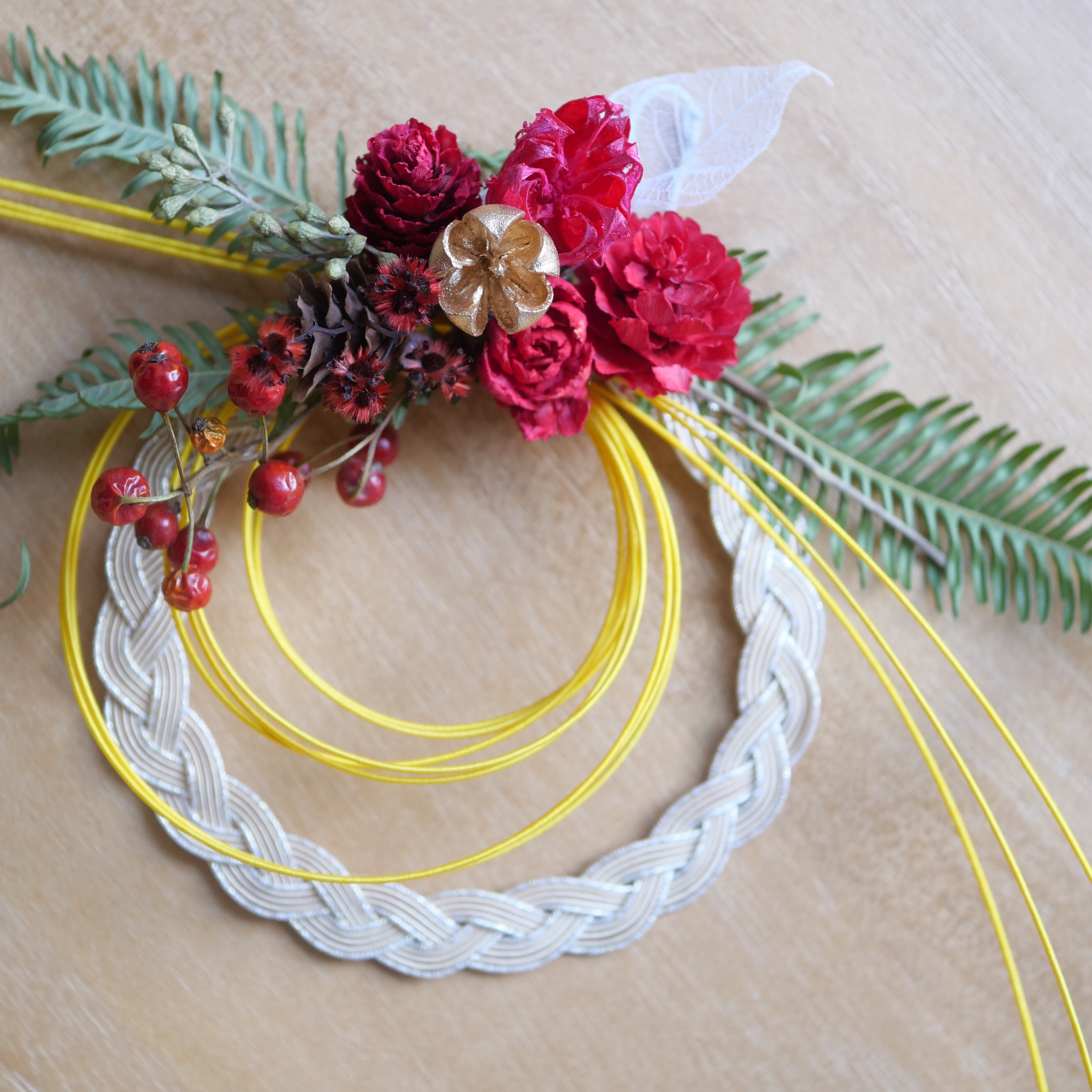 ミニサイズ水引リングにドライフラワーを付けた手のひらサイズの可愛い水引き飾りです。